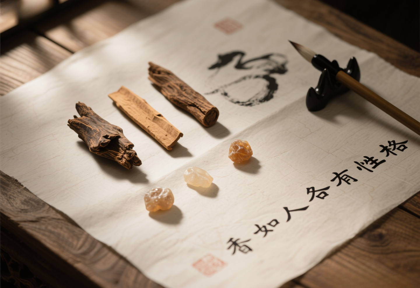 沉香安定、檀香中正、乳香柔順、龍腦清涼。